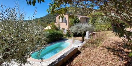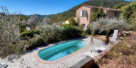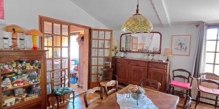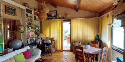 À 1 km environ du village, en situation dominante, IMPOSANTE VILLA au milieu de la végétation, construite sur trois niveaux de 152 m² habitable (Loi Carrez), plus 140 m² de GARAGE (permis de construire du 19 juin 1978, certificat de conformité du 10 Juillet 1980), avec : hall d’entrée, vaste cuisine équipée, séjour, salle à manger avec cheminée donnant sur bureau et véranda ouverte sur le jardin. Une première chambre (20 m²) en rez-de-chaussée avec sa salle de bains, WC. Deux autres chambres à l’étage de 20 m², chacune avec sa salle d’eau, WC. Nombreux placards et rangements.