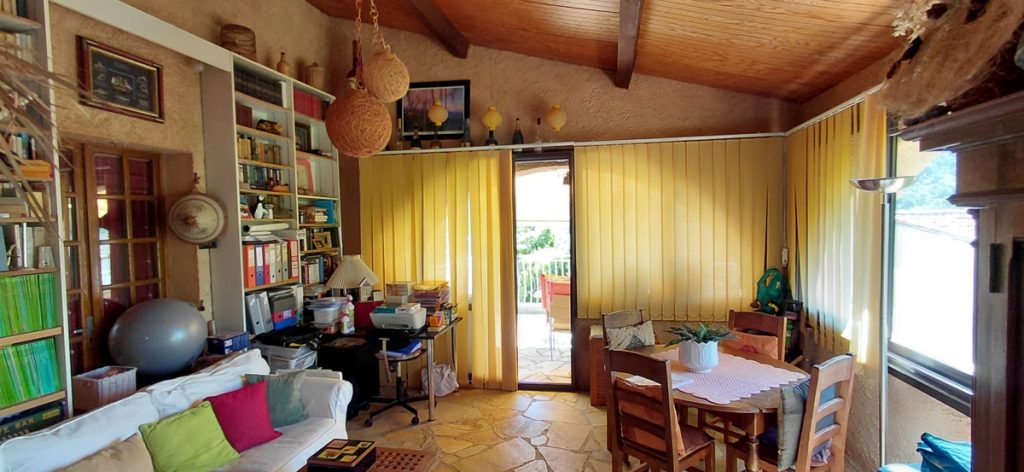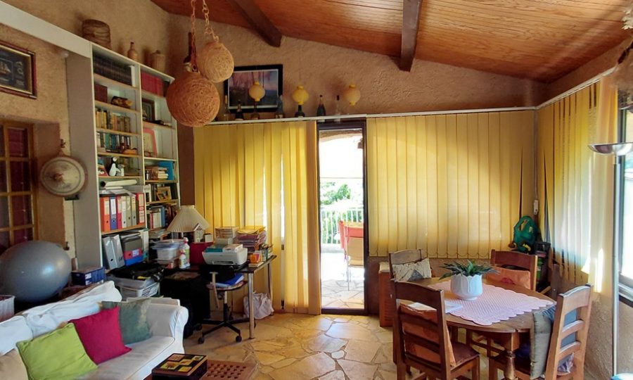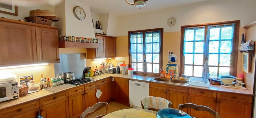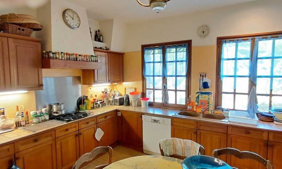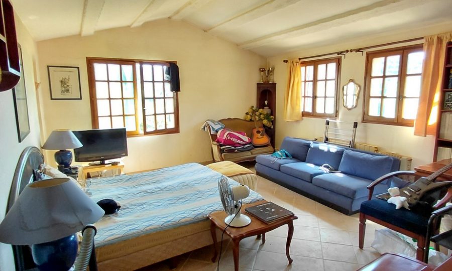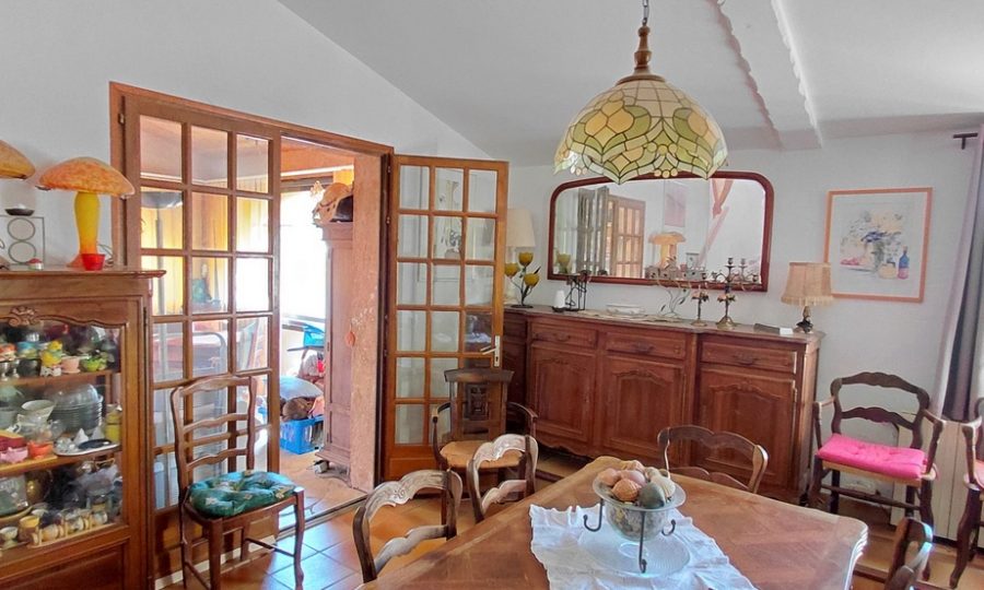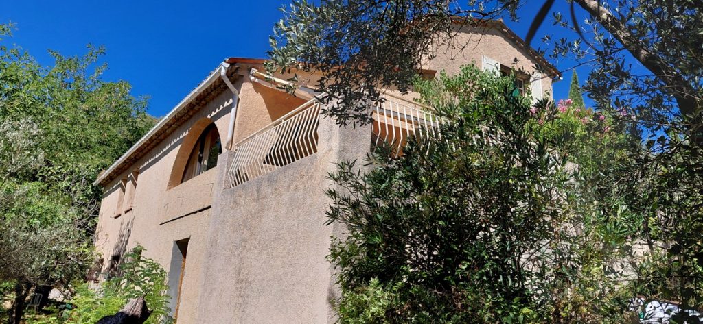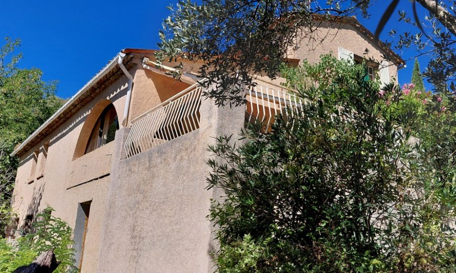 À 1 km environ du village, en situation dominante, IMPOSANTE VILLA au milieu de la végétation, construite sur trois niveaux de 152 m² habitable (Loi Carrez), plus 140 m² de GARAGE (permis de construire du 19 juin 1978, certificat de conformité du 10 Juillet 1980), avec : hall d’entrée, vaste cuisine équipée, séjour, salle à manger avec cheminée donnant sur bureau et véranda ouverte sur le jardin. Une première chambre (20 m²) en rez-de-chaussée avec sa salle de bains, WC. Deux autres chambres à l’étage de 20 m², chacune avec sa salle d’eau, WC. Nombreux placards et rangements.