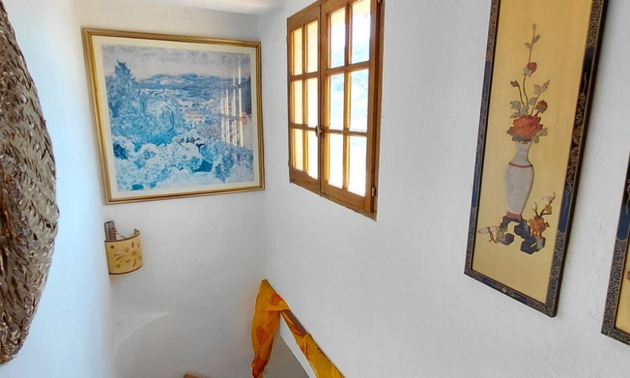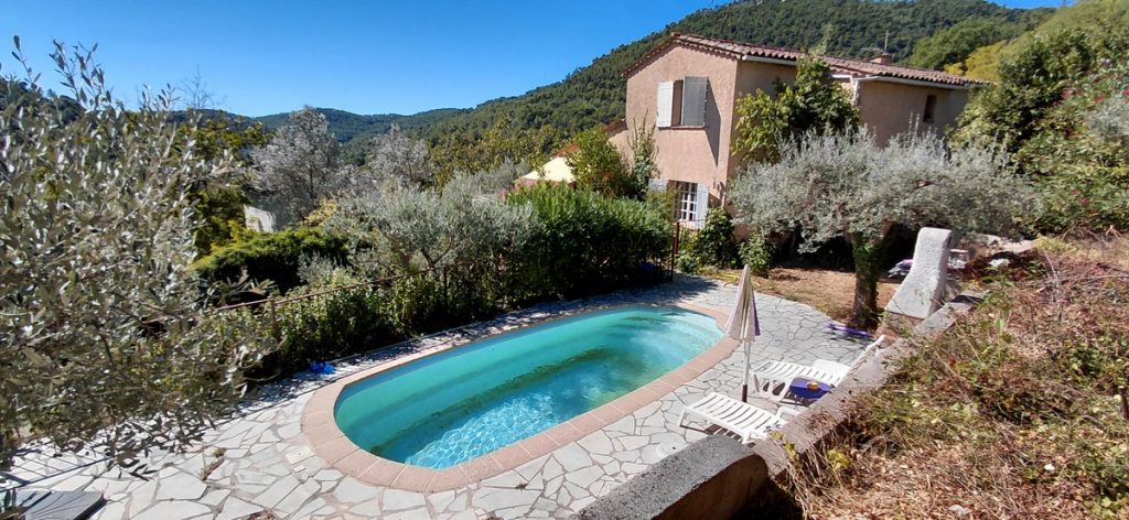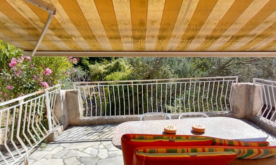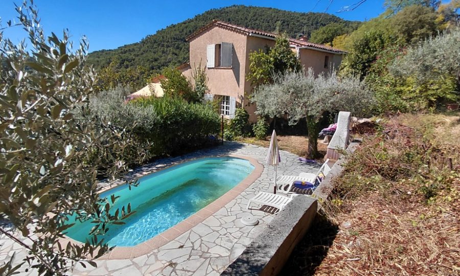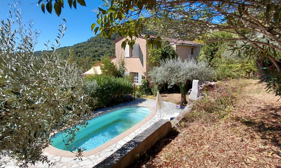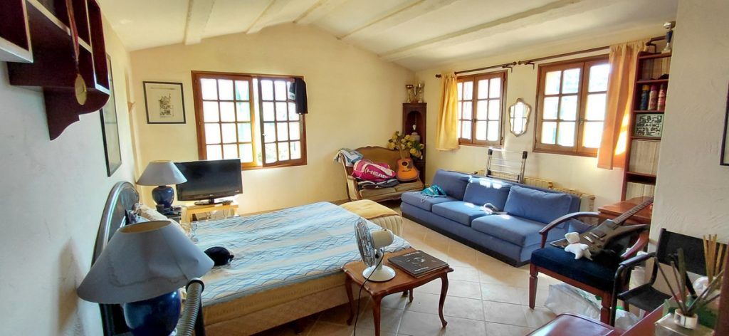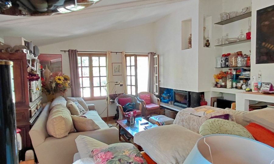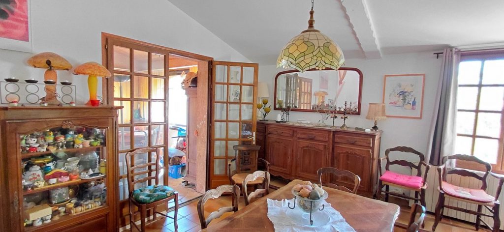 À 1 km environ du village, en situation dominante, IMPOSANTE VILLA au milieu de la végétation, construite sur trois niveaux de 152 m² habitable (Loi Carrez), plus 140 m² de GARAGE (permis de construire du 19 juin 1978, certificat de conformité du 10 Juillet 1980), avec : hall d’entrée, vaste cuisine équipée, séjour, salle à manger avec cheminée donnant sur bureau et véranda ouverte sur le jardin. Une première chambre (20 m²) en rez-de-chaussée avec sa salle de bains, WC. Deux autres chambres à l’étage de 20 m², chacune avec sa salle d’eau, WC. Nombreux placards et rangements.